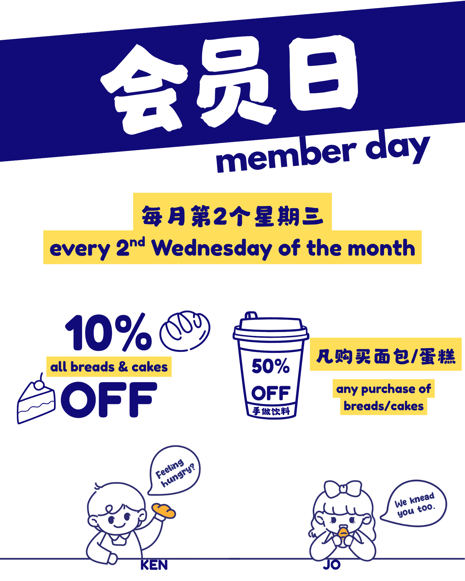 A little thank you for walking this journey with us — every 2nd Wednesday of the month, enjoy 10% off all breads and cakes, and 20% off all handcrafted drinks.
