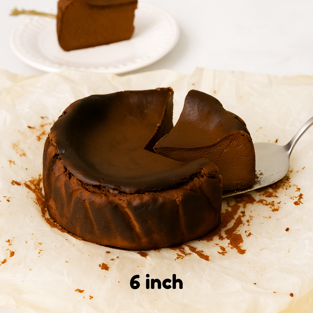 Deep, dark, and decadent — this chocolate twist on the classic Basque is boldly rich with a creamy centre and caramelised top. Melt-in-the-mouth texture with bittersweet elegance in every bite.